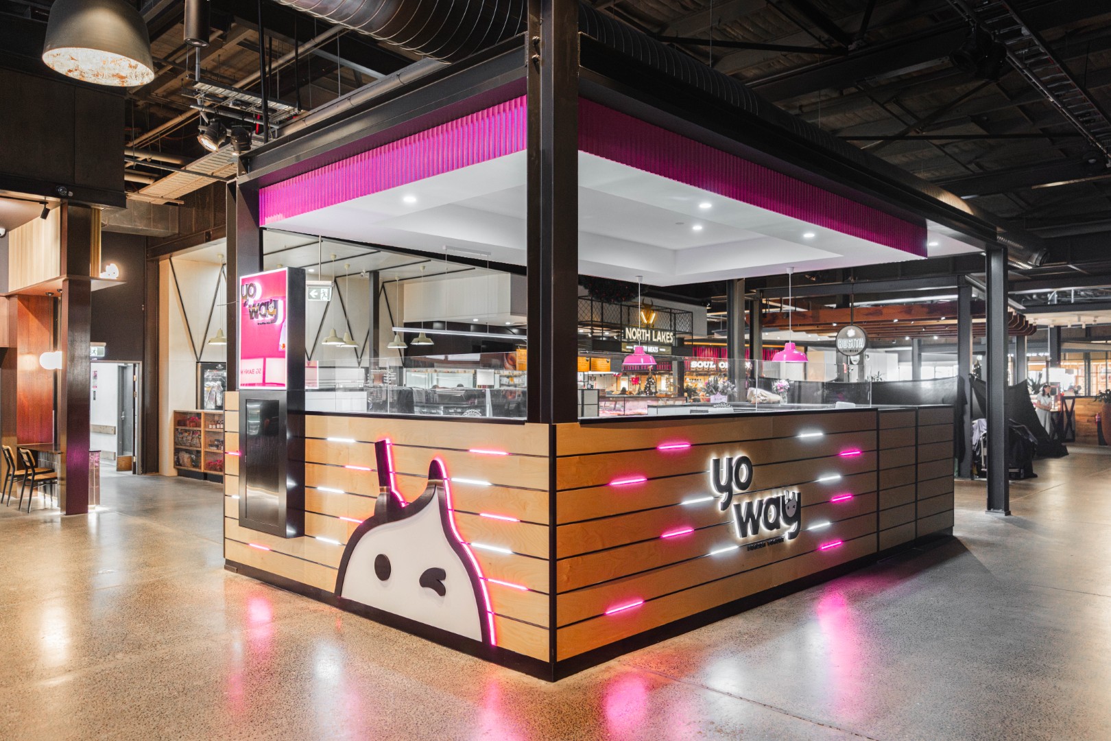 The Yoway North Lakes fitout was delivered by ENP Fitouts to bring the brand’s bold personality into an open-air kiosk format. The build features custom pink fluted cladding, curved stone counters, and a coordinated lighting package that includes LED accents, illuminated signage, and powder-coated feature pendants. Natural timber panels balance the bright colour palette, while clean equipment integration and precise detailing keep the kiosk efficient and visually consistent within a high-traffic precinct.