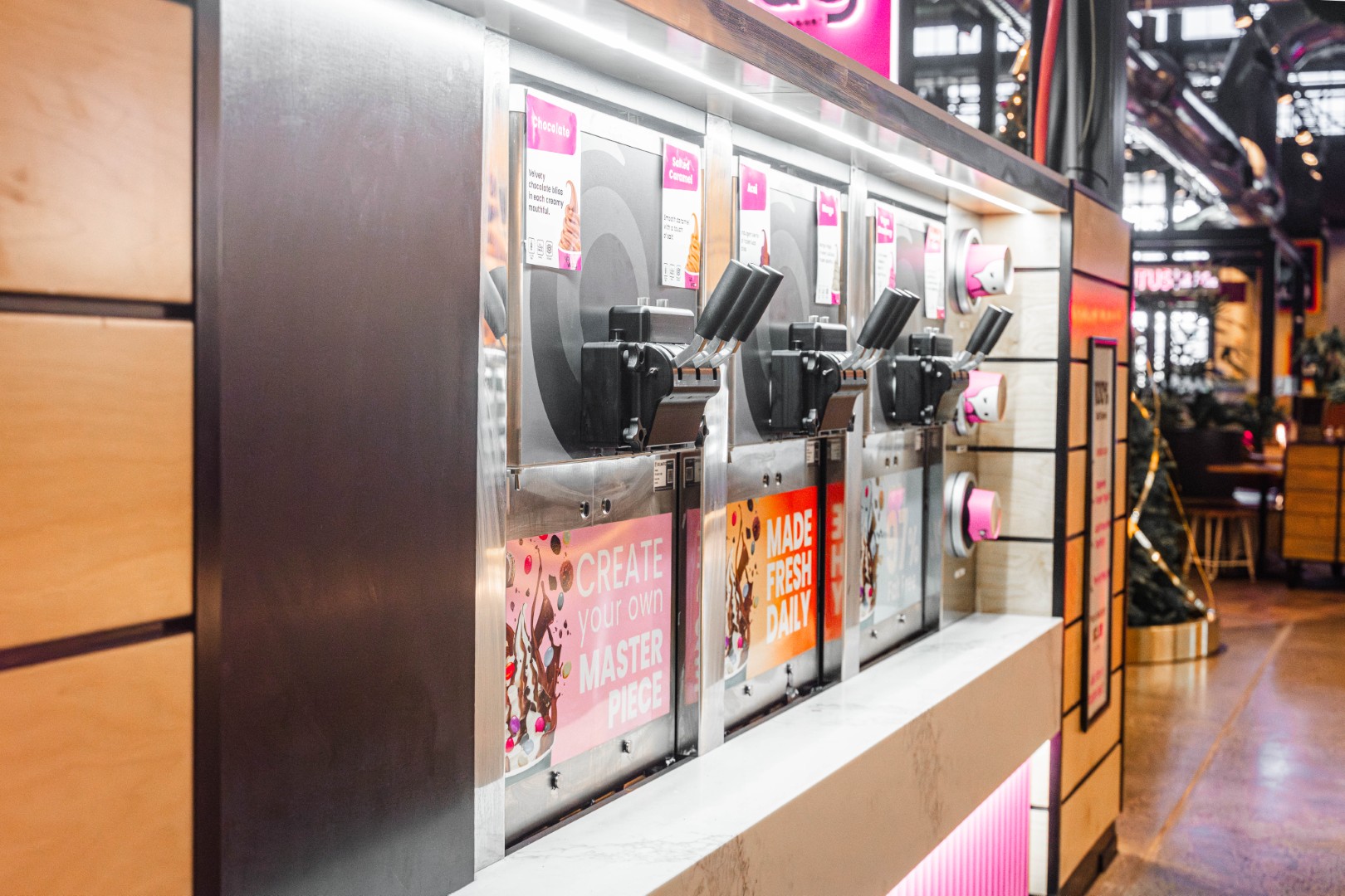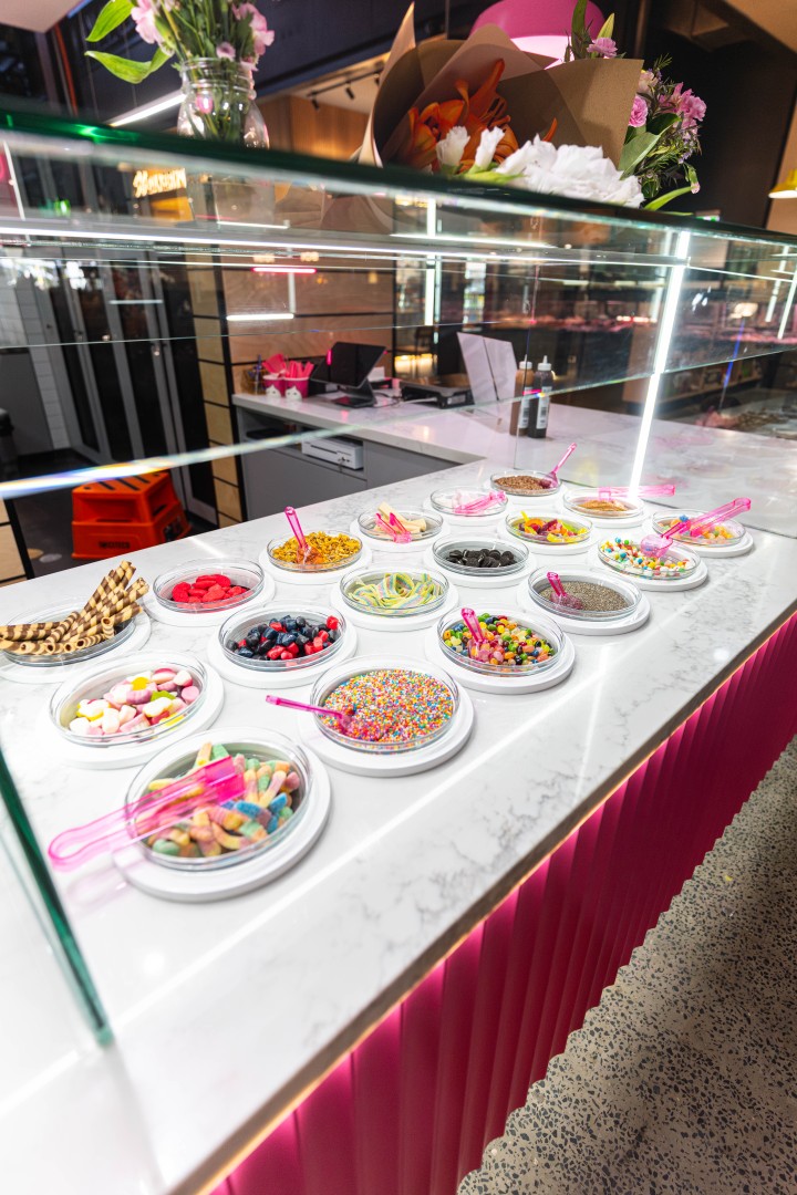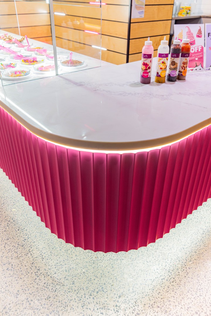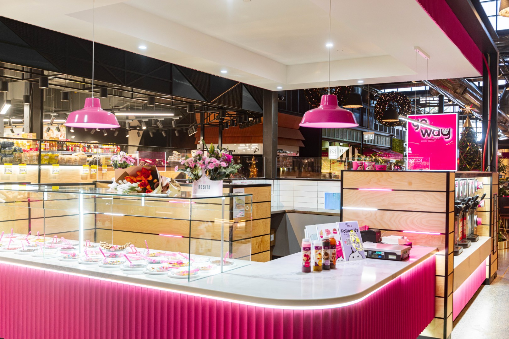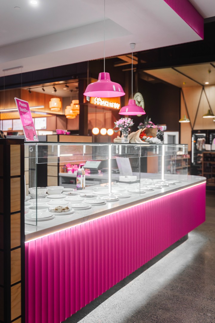 This vibrant Yoway North Lakes fitout was delivered by ENP Fitouts, transforming an open-air kiosk into a standout dessert destination through bold colour, refined detailing, and high-quality craftsmanship. The design centres around the brand’s signature pink, showcased through custom fluted panels, illuminated accents, and powder-coated feature pendants that create a cohesive visual identity from every angle. Timber cladding, curved stone countertops, and clean black framing balance the playful palette with a polished retail finish. Thoughtful integration of the soft-serve equipment, toppings display, and service counter ensures smooth workflow in a compact layout, while the lighting strategy enhances both product visibility and overall ambience. The result is a bright, inviting, and durable kiosk that commands attention within the busy North Lakes precinct.